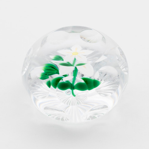 For starting collectors this miniature white flower paperweight is ideal. Measuring 6.2 cm wide by 4 cm high (2.44" x 1.57"), the delicate flower has a PH signature cane at the base of the stem and the paperweight is faceted with a starcut base.
